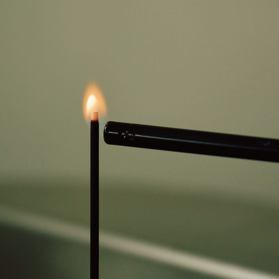 お香の先端に火をつけ、炎を消し、くゆらせてください。お香は少し離れたところから漂ってくるほのかな香りをお楽しみください。付属の香立は、灰が受けられる金属・陶器等の不燃性容器の上でご使用ください。