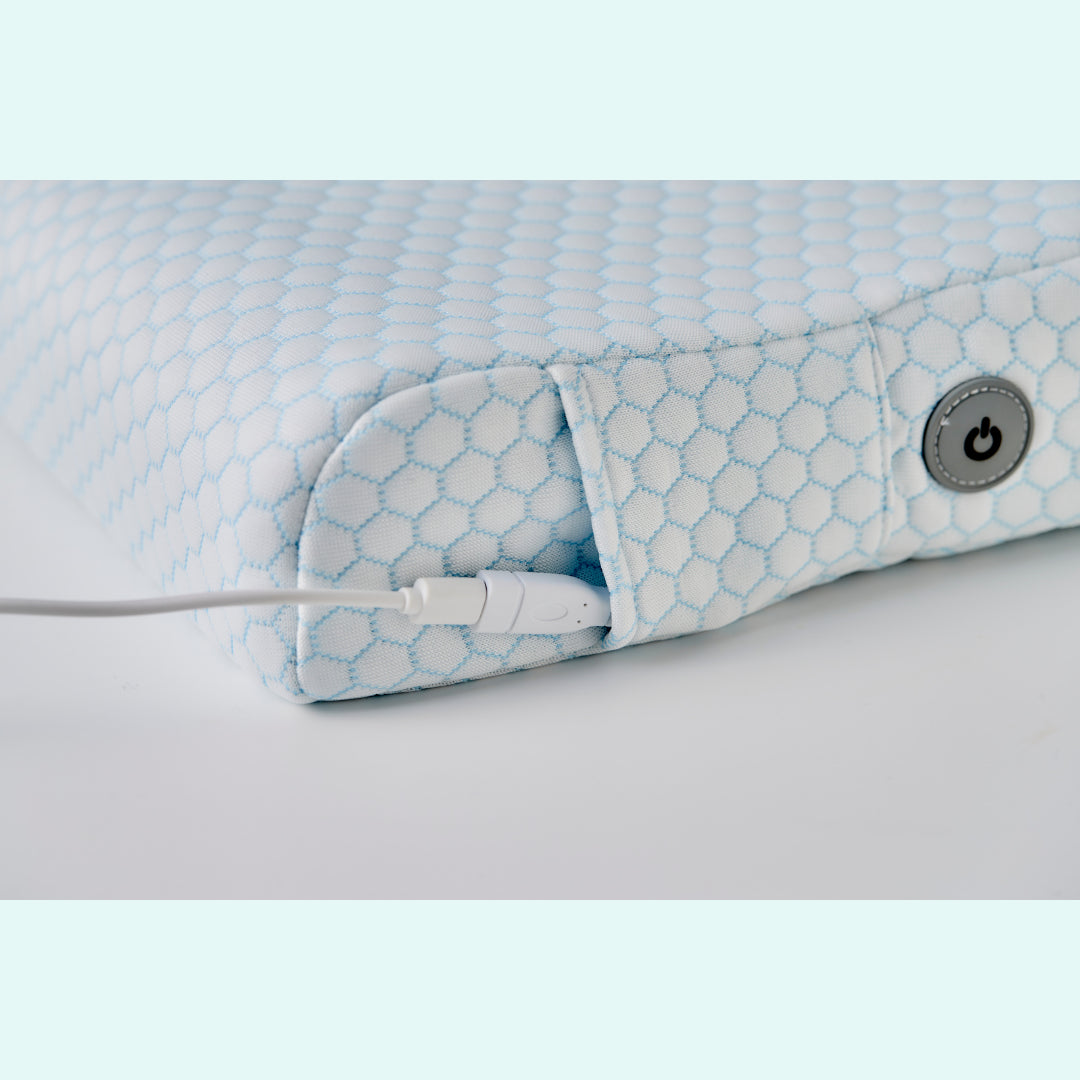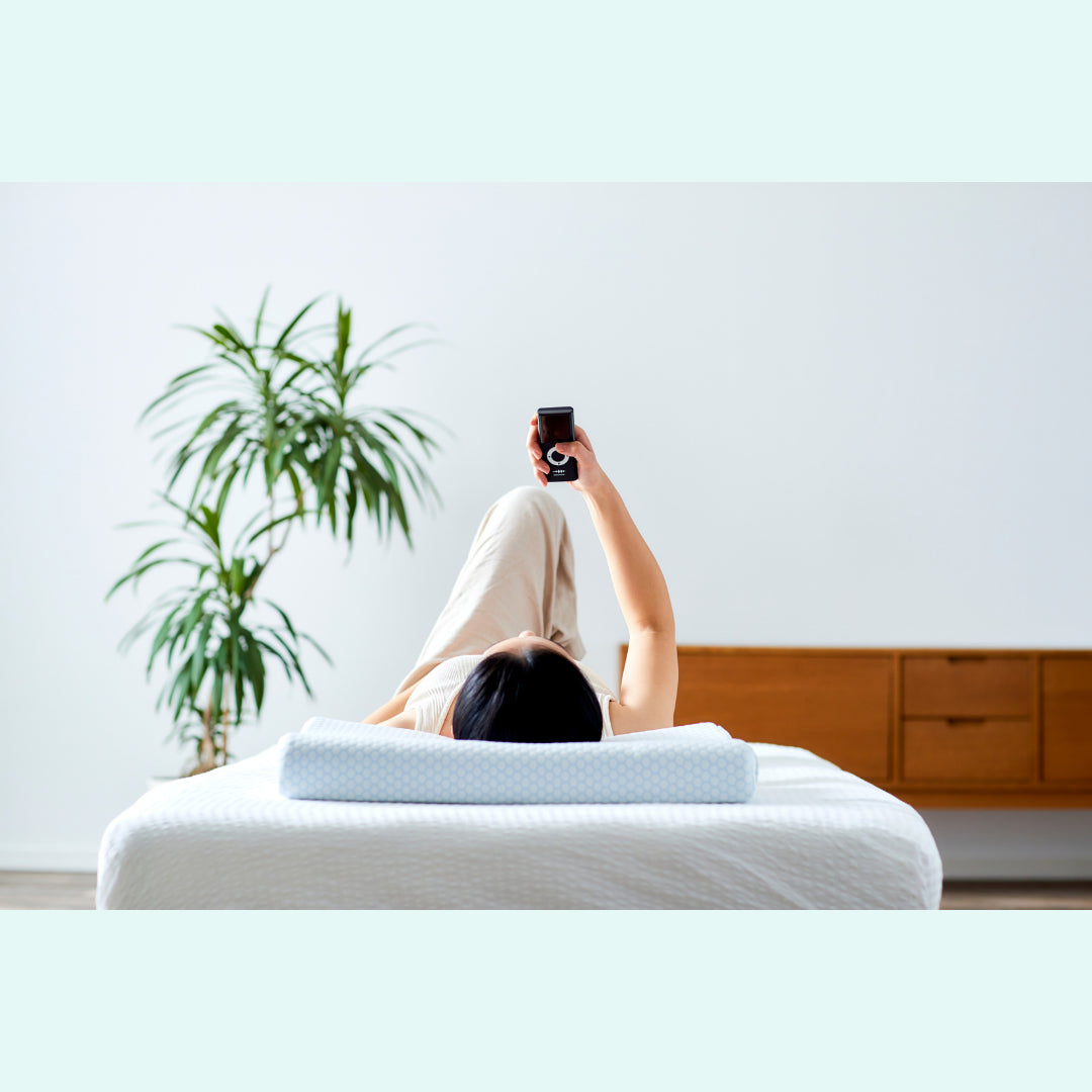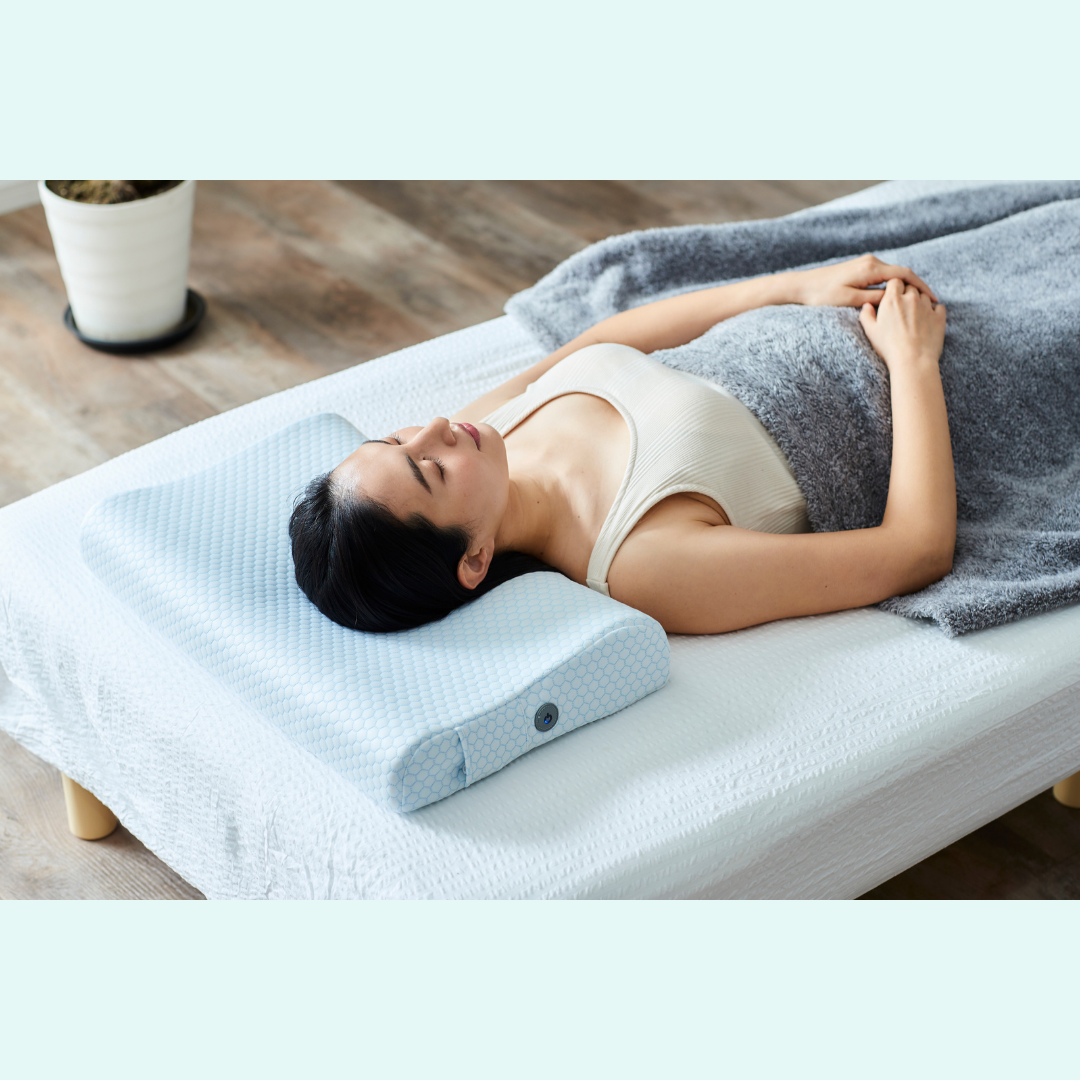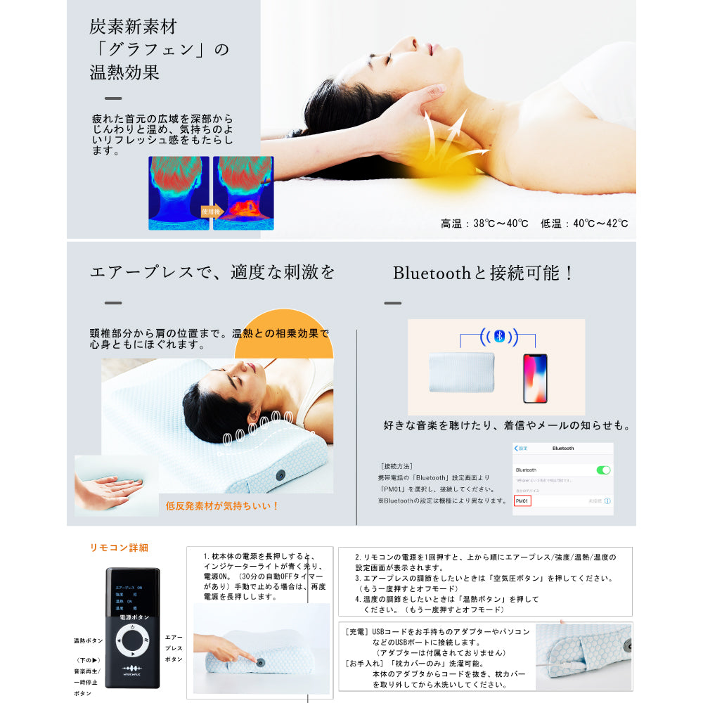 【ポイント1】:炭素新素材グラフェンで疲れた首元をじっくり温める。首元から広域に温め、しつこいコリや緊張を緩め、リラックスした状態で眠りにつくことができます。(低温モード:38~40℃・高温モード:40~42℃)