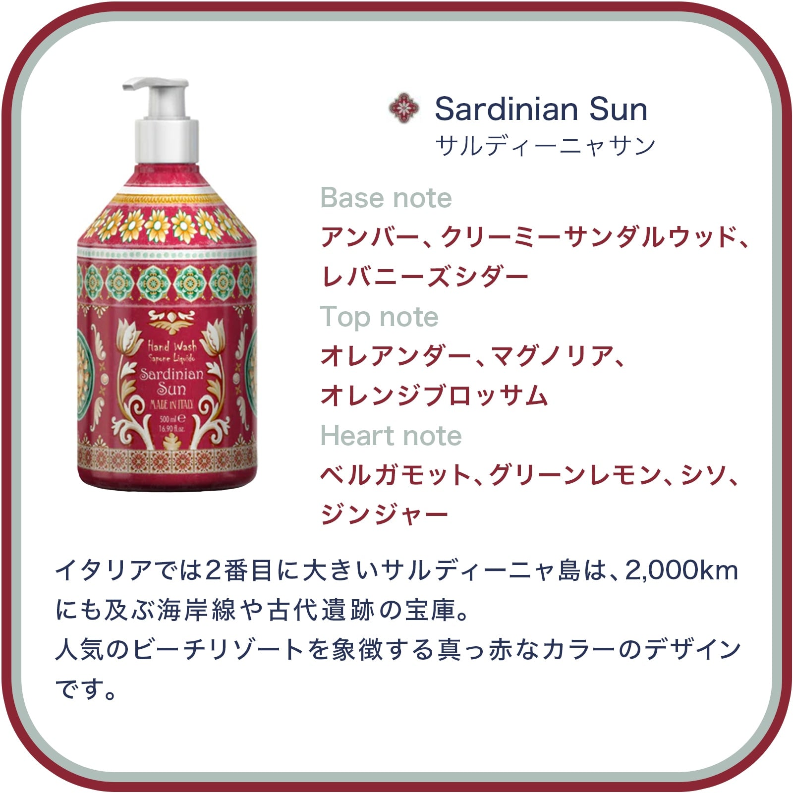 イタリアで2番目に大きいサルディーニャ島は 2,000km にも及ぶ海岸線や古代遺産の宝庫。人気のビーチリゾートを象徴する真っ赤なカラーのデザインです。