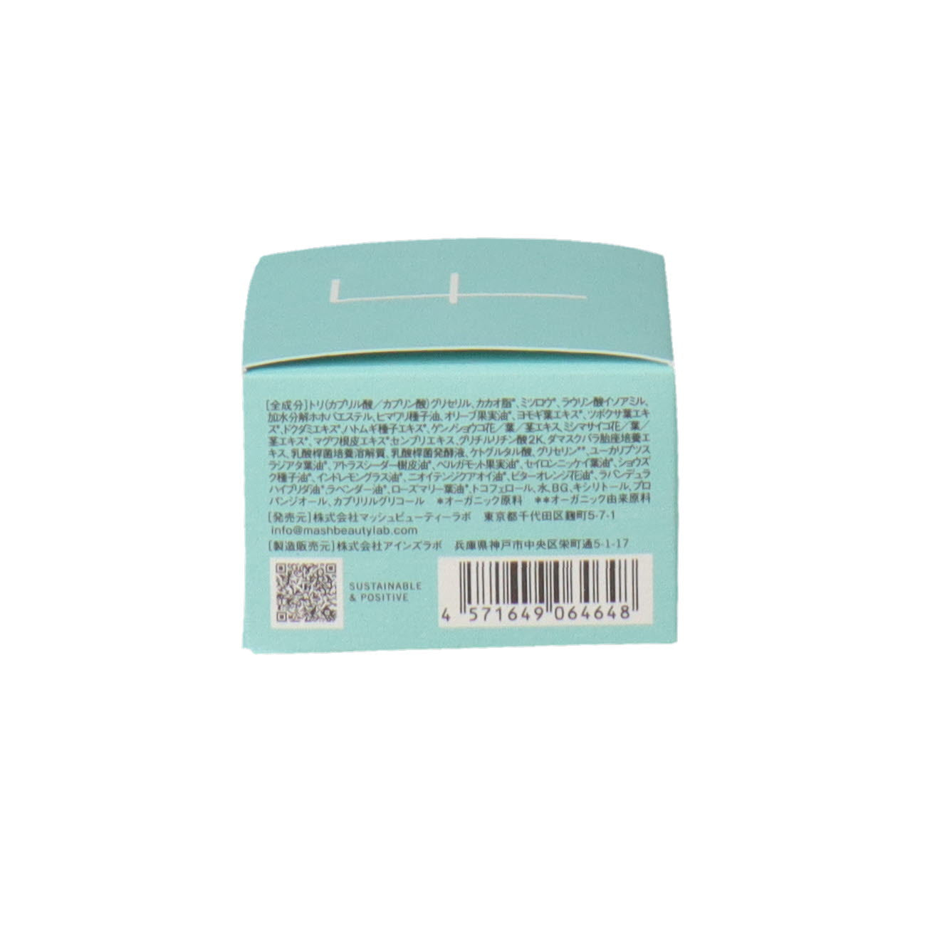 トリ(カプリル酸/カプリン酸)グリセリル、カカオ脂*、ミツロウ*、ラウリン酸イソアミル、加水分解ホホバエステル、ヒマワリ種子油、オリーブ果実油*、ヨモギ葉エキス*、ツボクサ葉エキス*、ドクダミエキス*、ハトムギ種子エキス*、ゲンノショウコ花/葉/茎エキス、ミシマサイコ花/葉/茎エキス*、マグワ根皮エキス*、センブリエキス、グリチルリチン酸2K、ダマスクバラ胎座培養エキス、乳酸桿菌培養溶解質、乳酸桿菌発酵液、ケトグルタル酸、グリセリン**、ユーカリプツスラジアタ葉油*、アトラスシーダー樹皮油*、ベルガモット果実油*、セイロンニッケイ葉油*、ショウズク種子油*、インドレモングラス油*、ニオイテンジクアオイ油*、ビターオレンジ花油*、ラバンデュラハイブリダ油*、ラベンダー油*、ローズマリー葉油*、トコフェロール、水、BG、キシリトール、プロパンジオール、カプリリルグリコール *オーガニック原料 **オーガニック由来原料