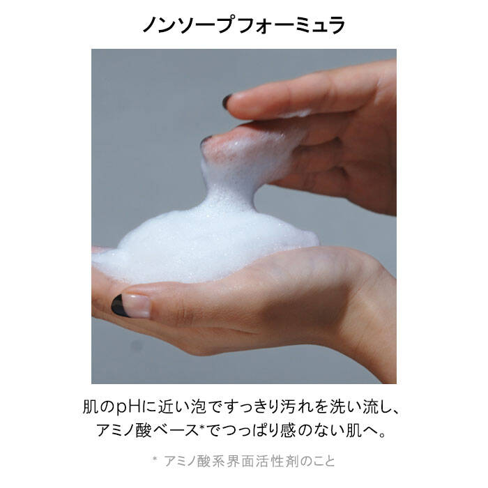 敏感肌のためにつくられたフォーミュラ。肌のpHに近い泡ですっきり汚れを洗い流し、アミノ酸ベース(ノンソープフォーミュラ)でつっぱり感のない肌へ。
