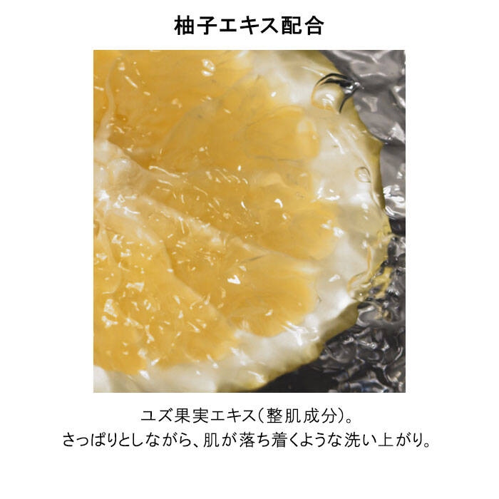 ユズ果実エキス(整肌成分)。洗顔フォームならではのさっぱりとした洗い上りでありながら、肌が落ち着くような心地よい洗い上がり。