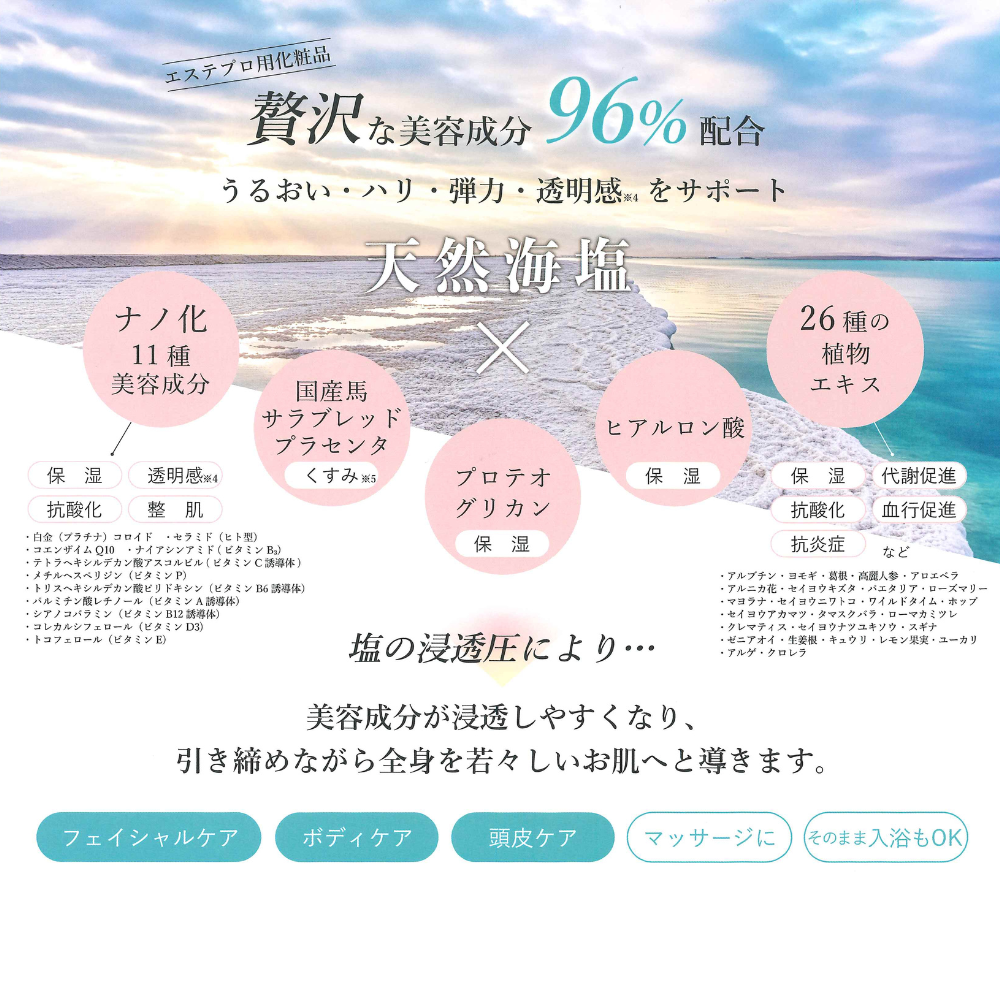 また、塩の発汗効果でむくみや体内の余分な老廃物を放出するデトックスもサポートしながら、天然海塩の高ミネラルと厳選美容エキスでお肌に自然な潤いを与えます。