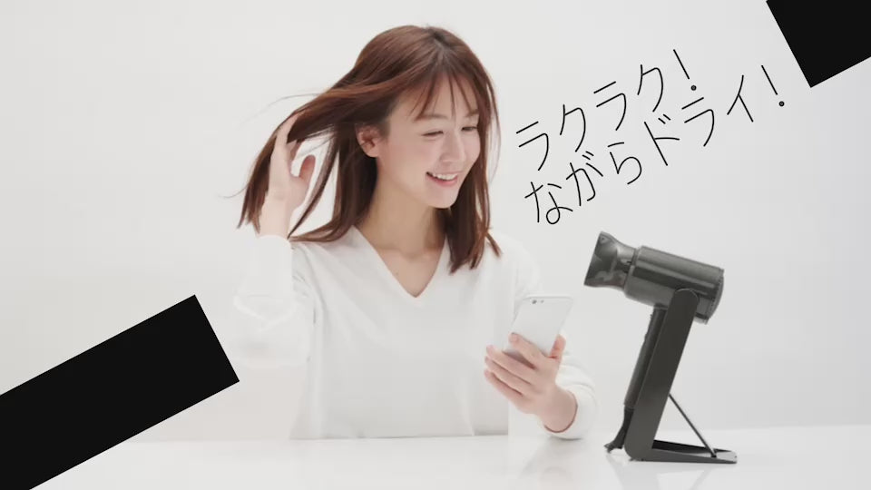 さらに、リンゴ1個分相当の約 370g の軽量に加え、ドライヤー初の折りたたみ式ハンズフリースタンドで、スマホを見ながら、歯を磨きながらなど、タイムパフォーマンスを上げる「ながらドライ」を実現しました。