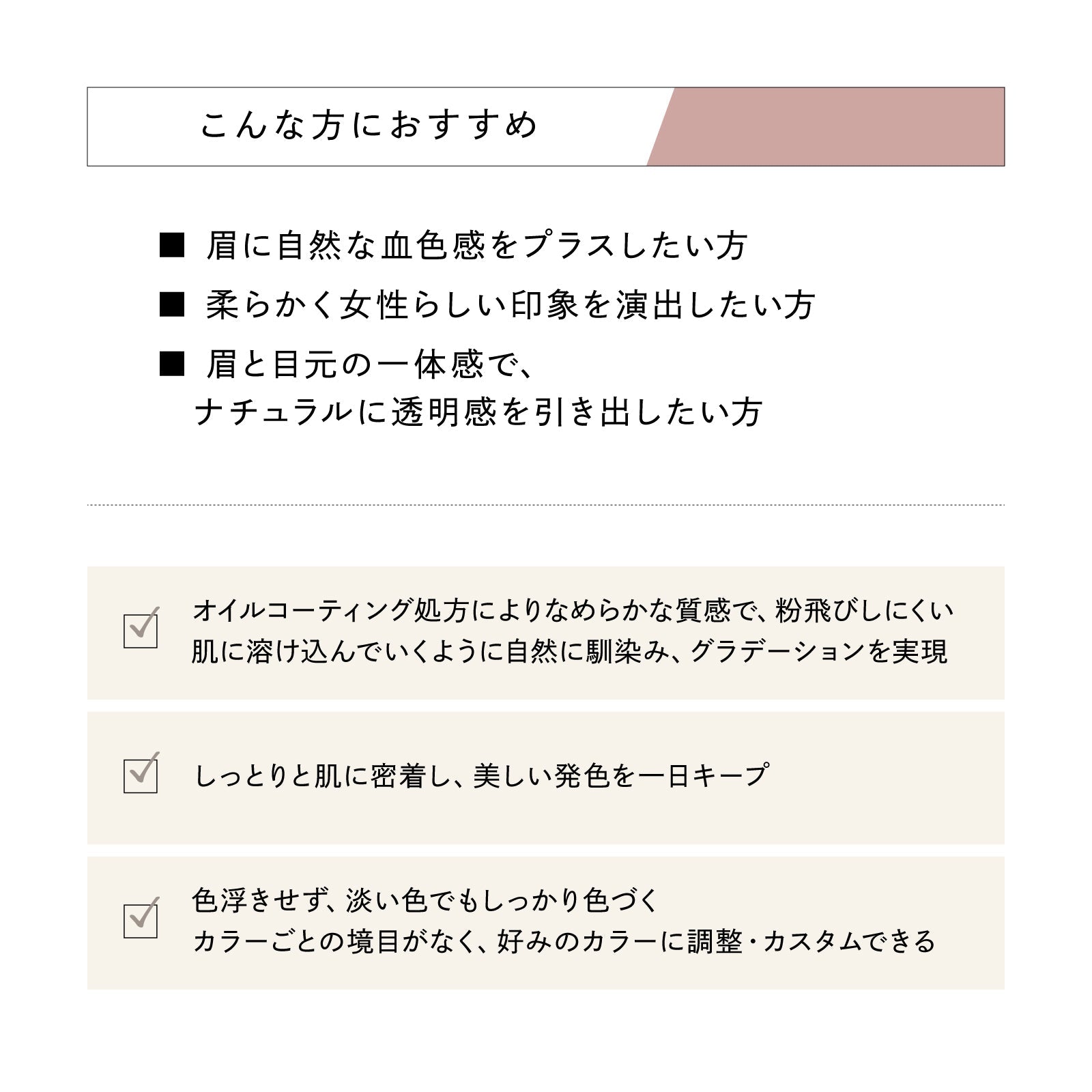 高発色。重ねてもダマになりにくい。眉一本一本をコーティングし、自然な仕上がりをキープ。