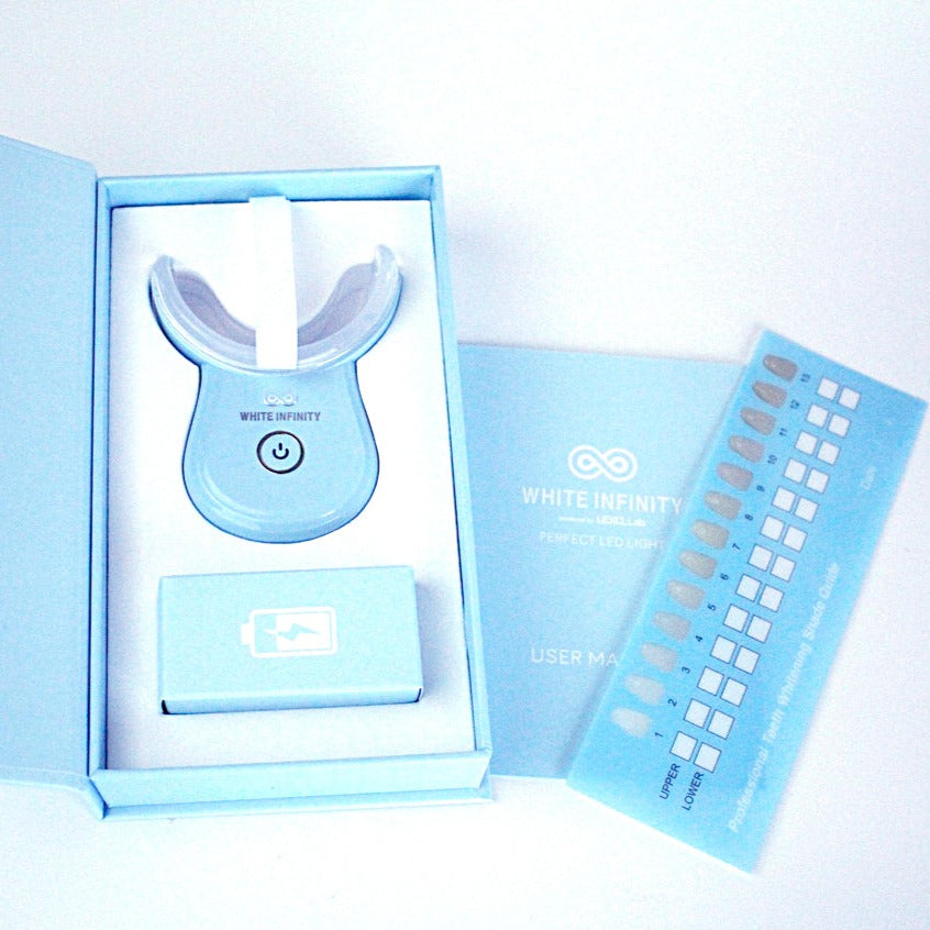 ホワイトインフィニティの歯磨きジェルに含まれる酸化チタンと酸化タングステンがソニック歯ブラシやマウスピース機器のLEDと反応し、汚れを分解・浮かせて落とし、歯を本来の色へ導きます。