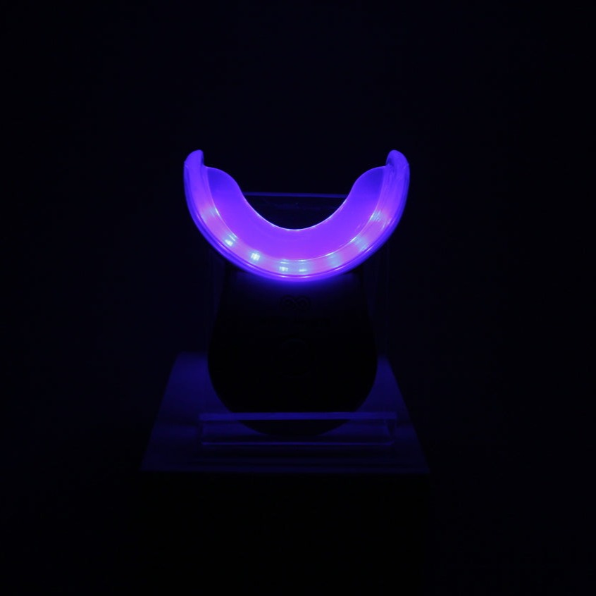 プレミアムホワイトニングで歯磨き後、うがいをする前にLEDライトをくわえて10分。その後再度ブラッシング。