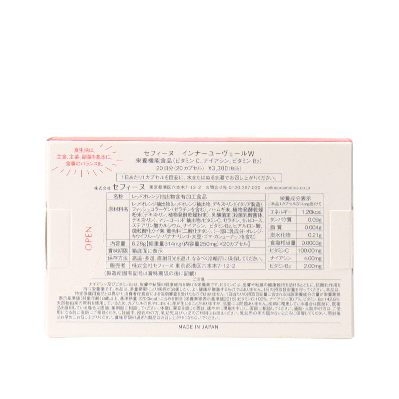 レッドオレンジ抽出物、デキストリン、コラーゲンペプチド(魚鱗由来)、ハトムギ末、植物発酵乾燥粉末、マリーゴールド抽出物、乳酸菌(殺菌)、ビタミンC、ゼラチン、セルロース、ステアリン酸カルシウム、ナイアシン、ビタミンB2、ヒアルロン酸、微粒酸化ケイ素、着色料(二酸化チタン)(原材料の一部にオレンジ、キウイフルーツ、バナナ、リンゴ、大豆、ゴマ、カシューナッツ含む)