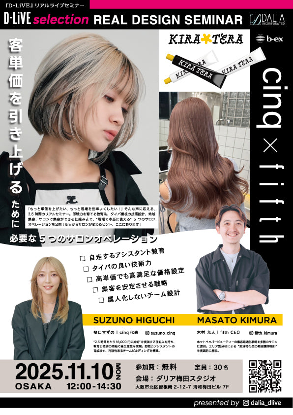 cinq代表の樋口すずのさん、fifth CEOの木村 允人さんのお二人が、即戦力を育てる教育法、タイパ重視の技術設計、地域集客、サロンで集客ができる仕組みまで、"現場で本当に使える" 5つのサロンオペレーションを公開!
