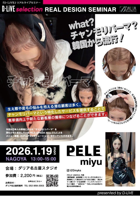 今回のセミナーでは、日本人の骨格に合わせた "チャンモリパーマ" を深化させ成功している PELE UMEDA miyuさんによる、メニュー提案(モデルデモンストレーション)を行なっていただきます。