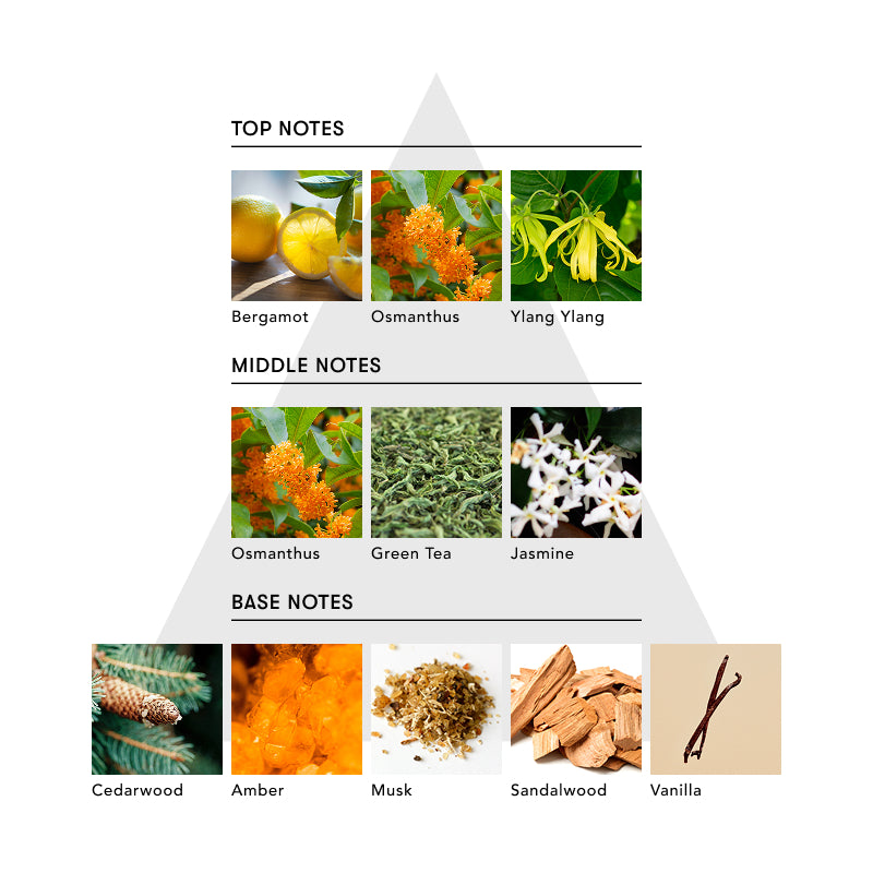 声を張らずとも伝わる、静かな存在感。それはまるで、秋の空気にそっと溶け込む金木犀の香りのよう。ベルガモットと金木犀がふんわりと立ち上り、グリーンティーとジャスミンが清らかさと静けさを重ねていく。そこにイランイランの甘さが奥行きを添え、サンダルウッドとバニラがやさしく余韻を包み込む。どこか儚く、透明感をたたえた香りは、主張しなくても心に残る。“美しいあり方” をそっと代弁する、静けさのなかの品格。