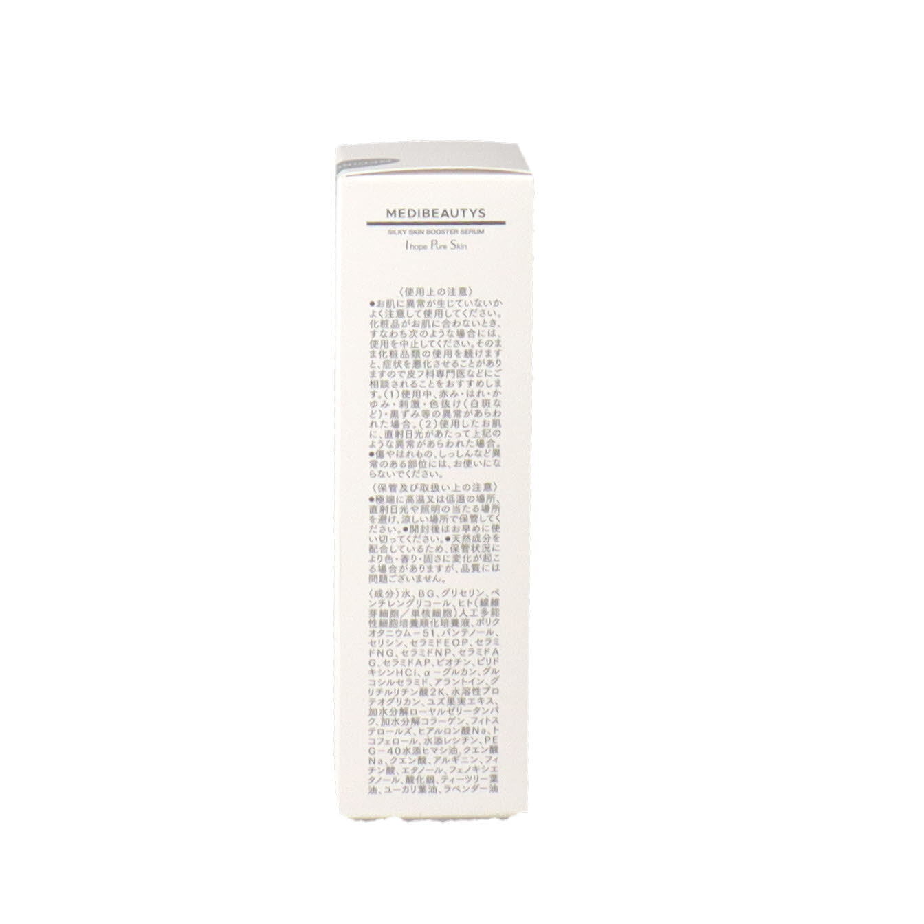 水、BG、グリセリン、ペンチレングリコール、ヒト(線維芽細胞/単核細胞)人工多能性細胞培養順化培養液、ポリクオタニウム-51、パンテノール、セリシン、セラミドEOP、セラミドNG、セラミドNP、セラミドAG、セラミドAP、ビオチン、ピリドキシンHCl、α-グルカン、グルコシルセラミド、アラントイン、グリチルリチン酸2K、水溶性プロテオグリカン、ユズ果実エキス、加水分解ローヤルゼリータンパク、加水分解コラーゲン、フィトステロールズ、ヒアルロン酸Na、トコフェロール、水添レシチン、PEG-40水添ヒマシ油、クエン酸Na、クエン酸、アルギニン、フィチン酸、エタノール、フェノキシエタノール、酸化銀、ティーツリー葉油、ユーカリ葉油、ラベンダー油