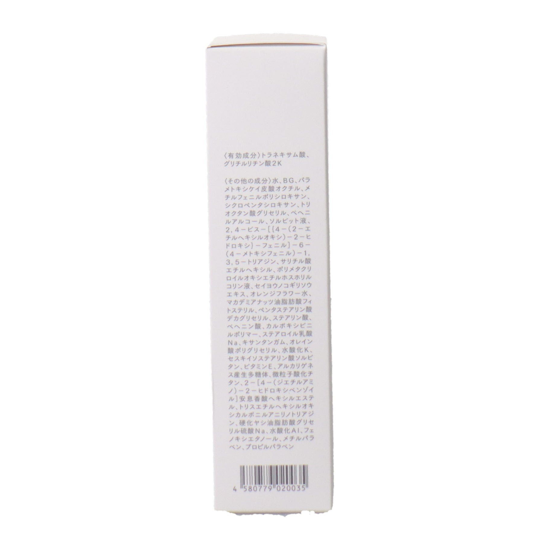 その他成分:水、BG、パラメトキシケイ皮酸オクチル、メチルフェニルポリシロキサン、シクロペンタシロキサン、トリオクタン酸グリセリル、ベヘニルアルコール、ソルビット液、2,4-ビス-[{4-(2-エチルヘキシルオキシ)-2-ヒドロキシ}-フェニル]-6-(4-メトキシフェニル)-1,3,5-トリアジン、サリチル酸エチルヘキシル、ポリメタクリロイルオキシエチルホスホリルコリン液、セイヨウノコギリソウエキス、オレンジフラワー水、マカデミアナッツ油脂肪酸フィトステリル、ペンタステアリン酸デカグリセリル、ステアリン酸、ベヘニン酸、カルボキシビニルポリマー、ステアロイル乳酸Na、キサンタンガム、オレイン酸ポリグリセリル、水酸化K、セスキイソステアリン酸ソルビタン、ビタミンE、アルカリゲネス産生多糖体、微粒子酸化チタン、2-[4-(ジエチルアミノ)-2-ヒドロキシベンゾイル]安息香酸ヘキシルエステル、トリスエチルヘキシルオキシカルボニルアニリノトリアジン、硬化ヤシ油脂肪酸グリセリル硫酸Na、水酸化Al、フェノキシエタノール、メチルパラベン、プロピルパラベン